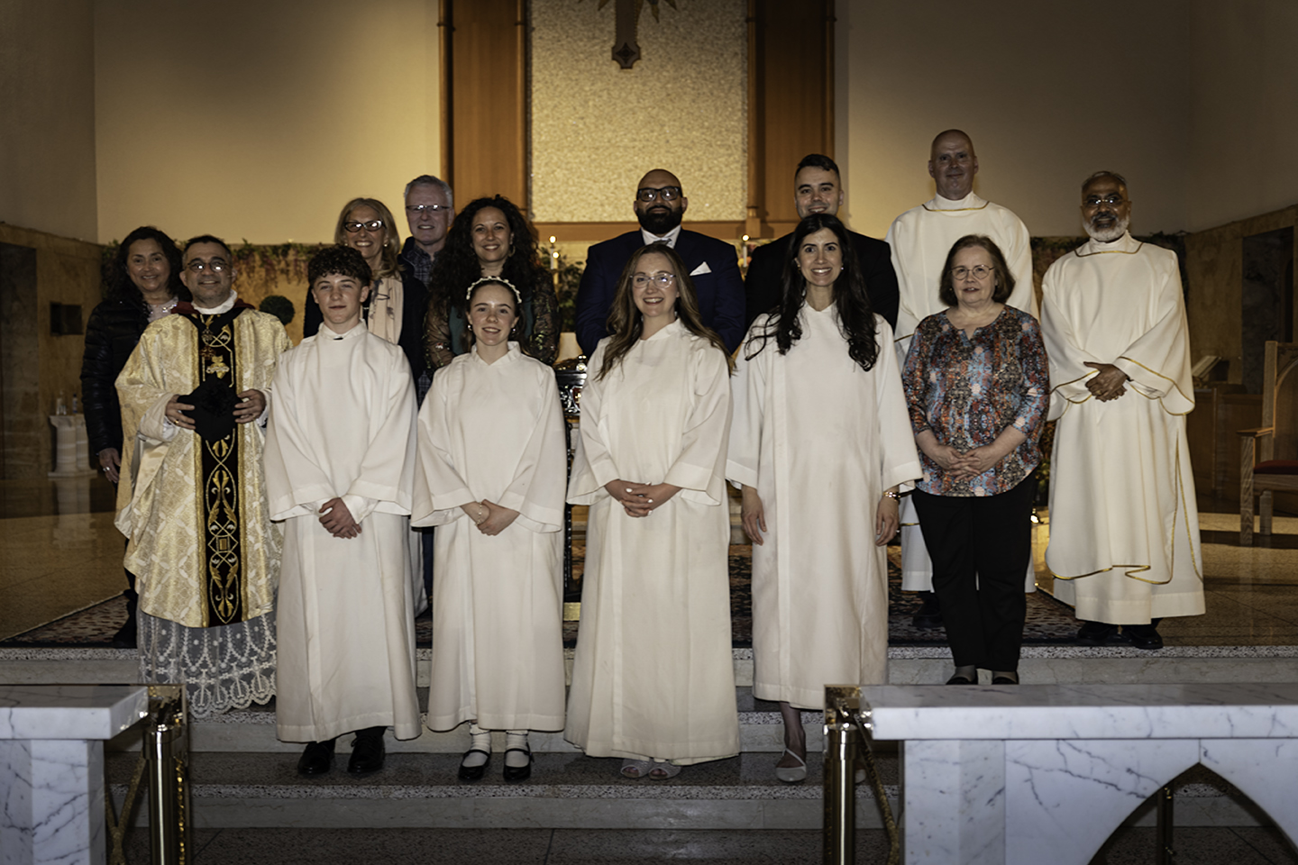 During the Easter Vigil Mass on Saturday evening, we welcomed four new Catholics to the Church! Front row (left to right): James Becker, Sydney Becker, Jessica Vasquez and Sarah Forgione. Fr. Edmund Luciano, our pastor, Deacons Greg and Ketan, their teachers, and their sponsors round out this happy group.
